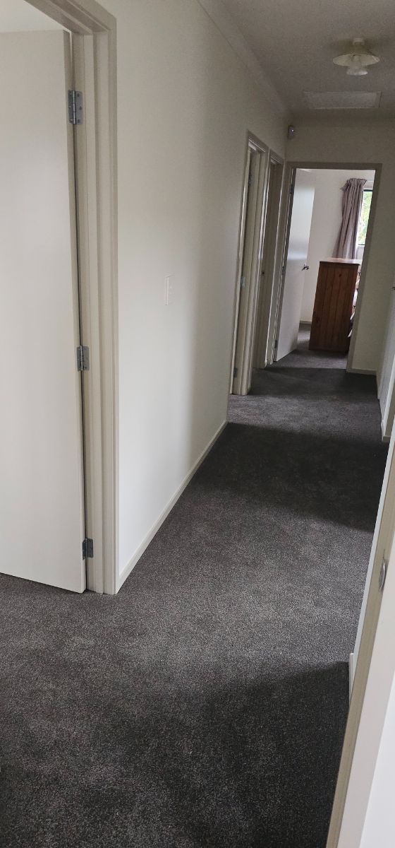 The insurance scope covered full strip-out of affected areas, replacement of ceilings, wall linings and damaged joinery, new skirtings and finishing lines, plastering and repainting throughout, new carpet and vinyl, and electrical/plumbing disconnects and reconnects. In parallel, we integrated client-requested upgrades: a Mitsubishi heat pump with concealed pipework, reconfigured power points and pendant lighting with minor re-wiring, new plumbing fixtures and services (including a relocated fridge line), and refreshed toilets and vanities. The kitchen was fully redesigned and replaced with full-height melamine cabinetry, a 20 mm engineered stone benchtop, an undermount sink, and quality hardware.